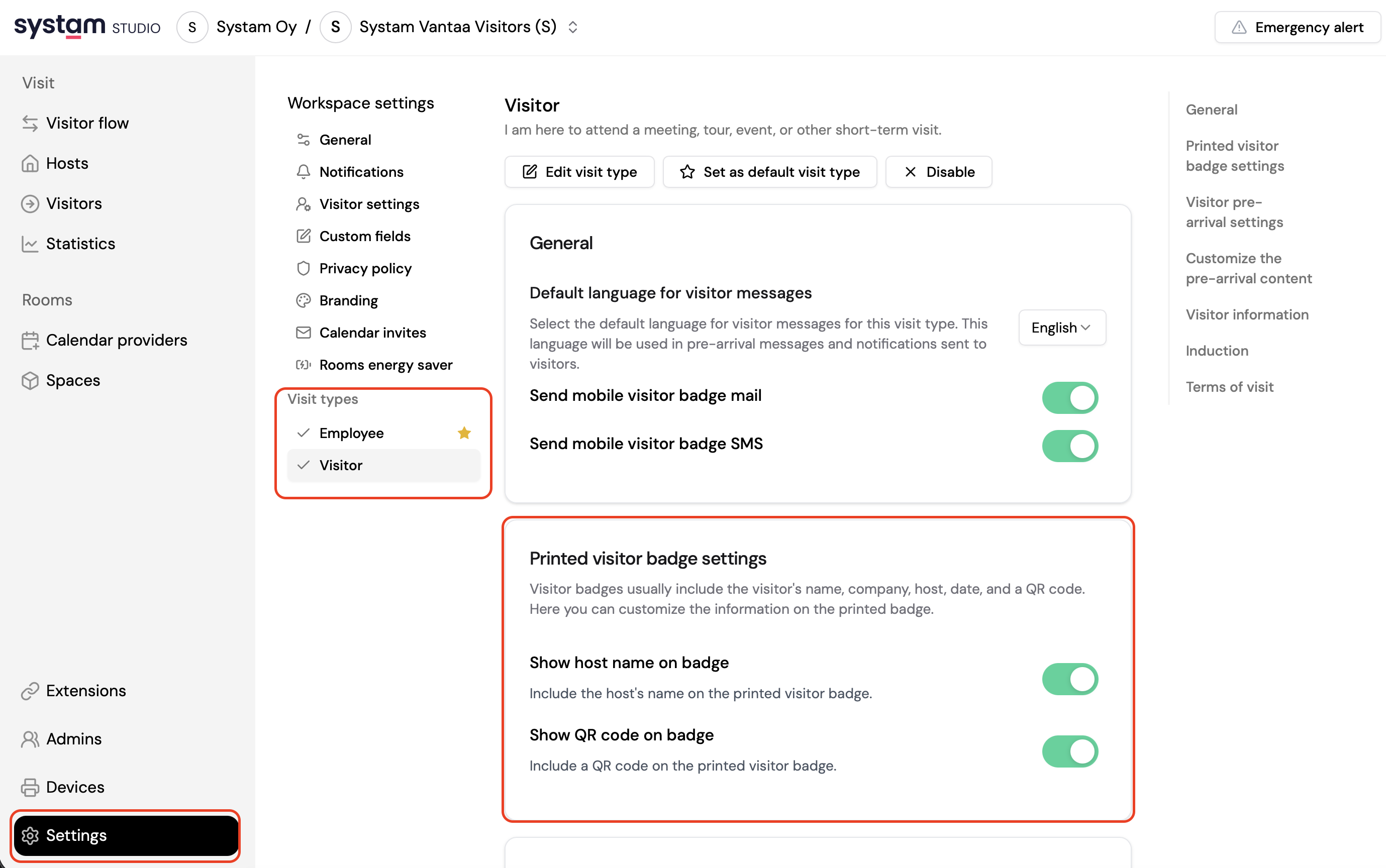 - Scroll to Printed visitor badge settings and adjust the settings. You can: